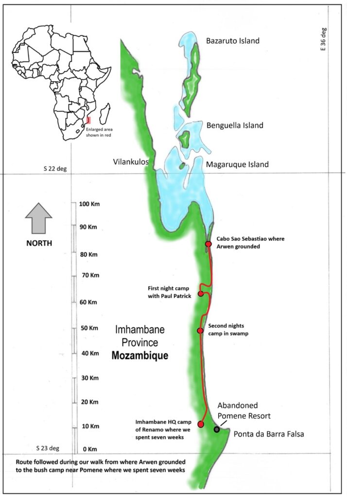We were captured in central Mozambique, about 30km south of a group of islands called the Bazaruto Archipelago. We were then forced to walk south with our captors for about 70km to an area near Pomene.